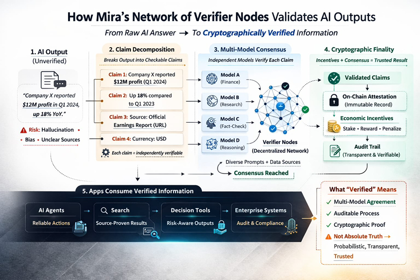 I don’t think the world needs more fluent AI. It needs AI that can be held to account. Mira is early and it carries real execution risk, but its design direction—breaking outputs into verifiable claims, validating them through multi-model consensus, and backing results with auditable artifacts and crypto-economic participation—aims at the right future shape.