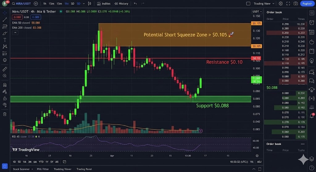 Support Zone Confirmed: The crucial support zone around $0.088 has proven to be a robust floor for the price. MIRA has repeatedly bounced off this level, demonstrating strong buying interest and preventing further downsides. This zone, marked in green, serves as a solid foundation for any potential upward move.