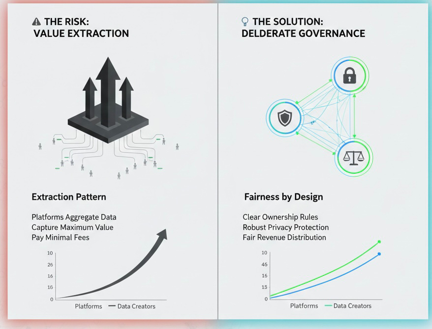 There is also a deeper concern about the direction of travel. The history of data-driven platform businesses is not encouraging for those hoping that robot data markets will generate broadly distributed economic benefits. Social media platforms were built on the premise that users would create content and that advertising revenue would support the platform. Over time, the economic reality became clear: platforms captured the vast majority of the value generated by user content, while the users who created it received almost nothing in return. The platform owners became extraordinarily wealthy. The users received a free service.