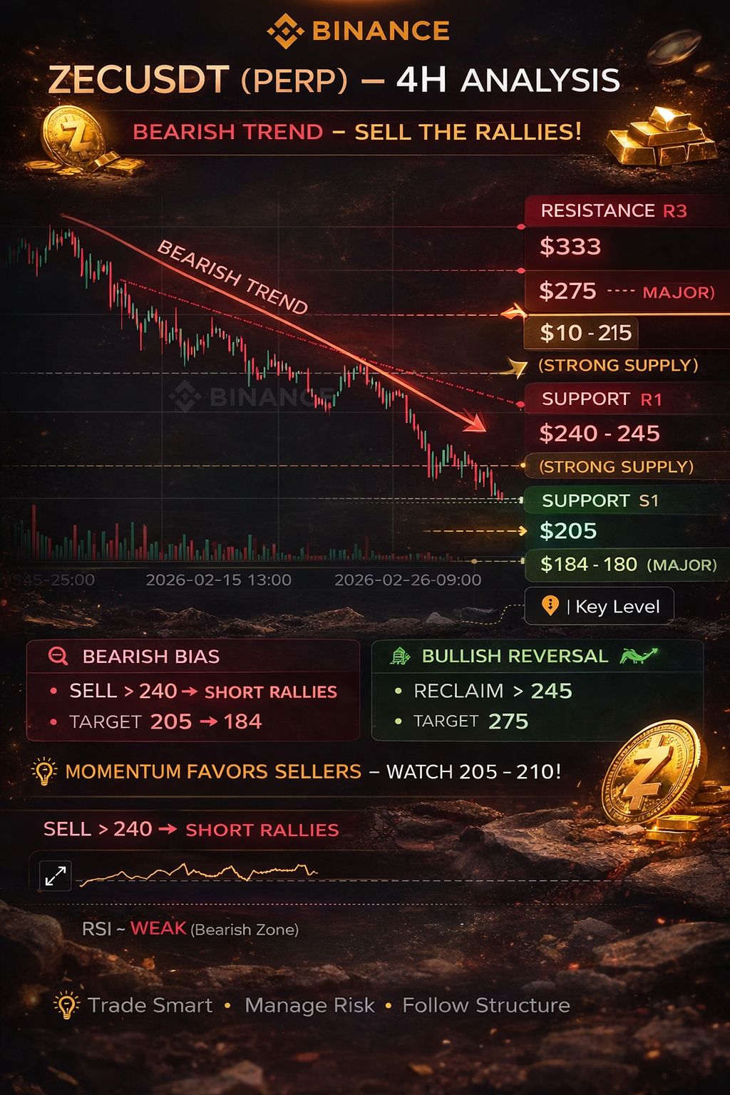 $ZEC If price loses 205, a move toward 184 becomes highly probable. However, a strong reclaim above 245 would be the first sign of structural recovery and could trigger a short squeeze toward 275.