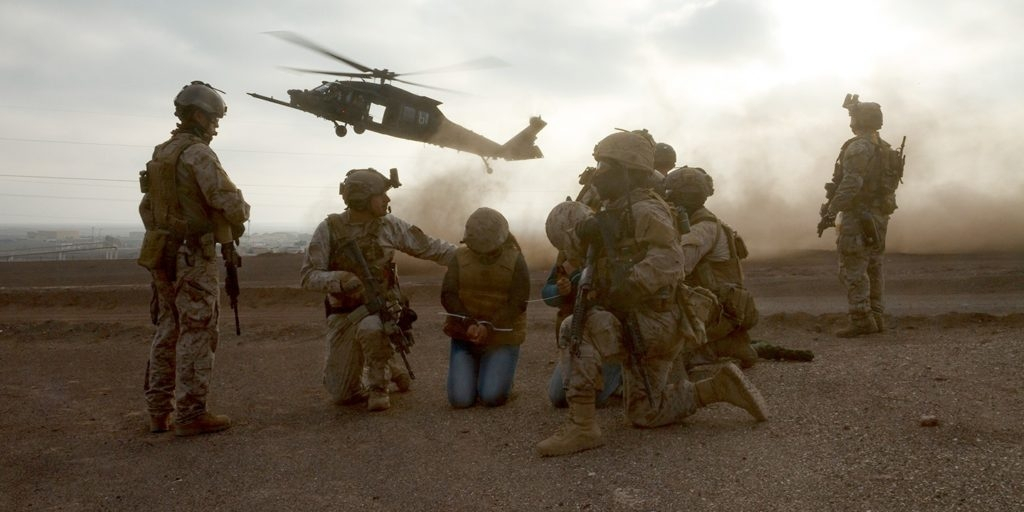 Outside the facility, a heavy C-17 transport plane lands in a nearby desert area temporarily lit by chemical green lights. The men transfer 23 cylinders of enriched uranium. They transfer 11 nuclear scientists, some in their pajamas, some with minor injuries. They transfer boxes of documents and hard drives.