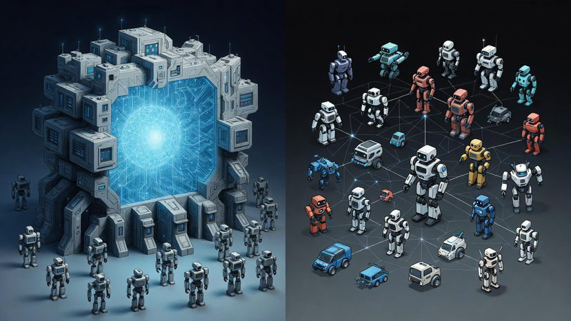 ➡️(Here, a conceptual image of decentralized robots collaborating in an urban environment, showing networked machines working together without central control.)