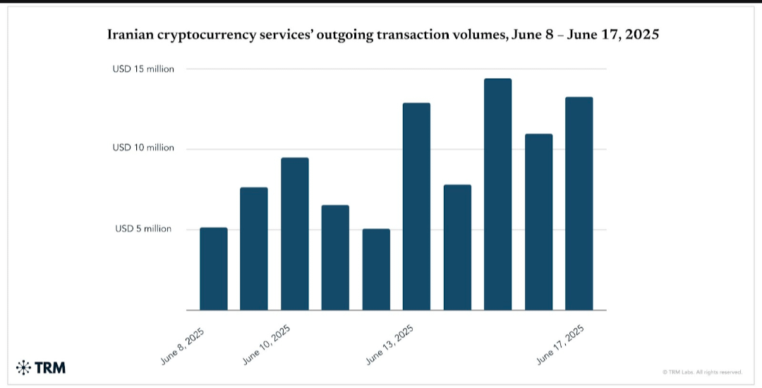 And a bar chart of Iranian crypto outflows during a prior escalation, illustrating the pattern of capital flight.