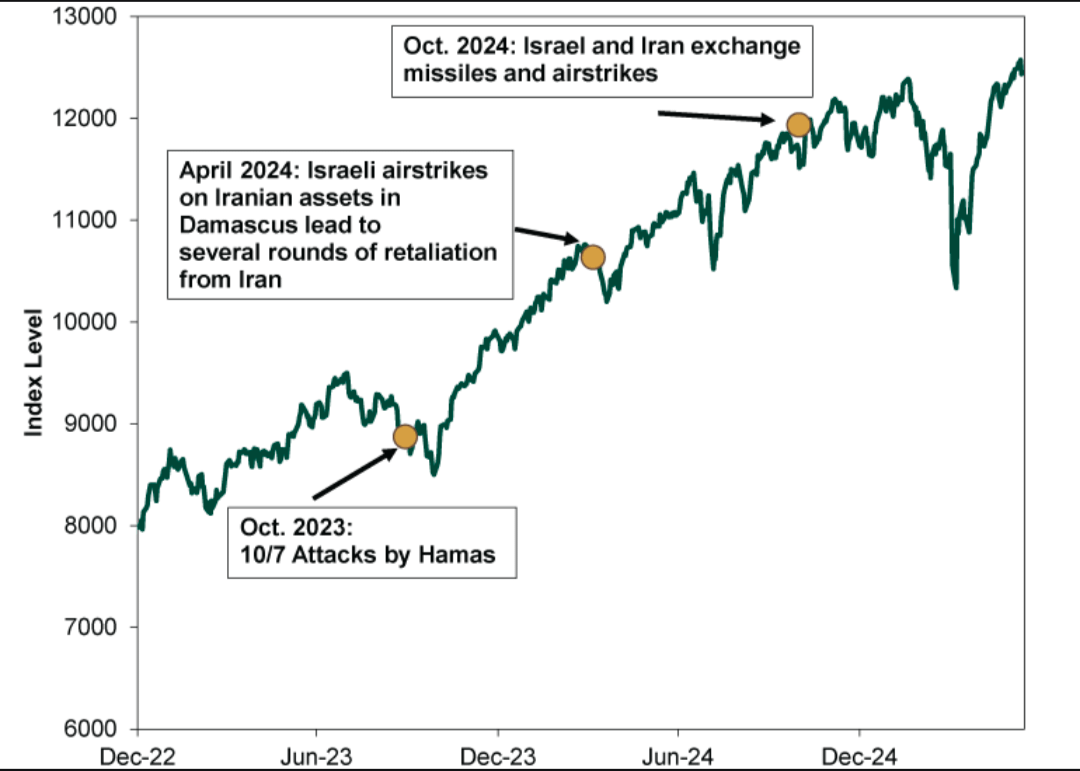 Here's a chart illustrating global stock performance (MSCI World Index) during recent Middle East conflicts, showing volatility but eventual recovery.
