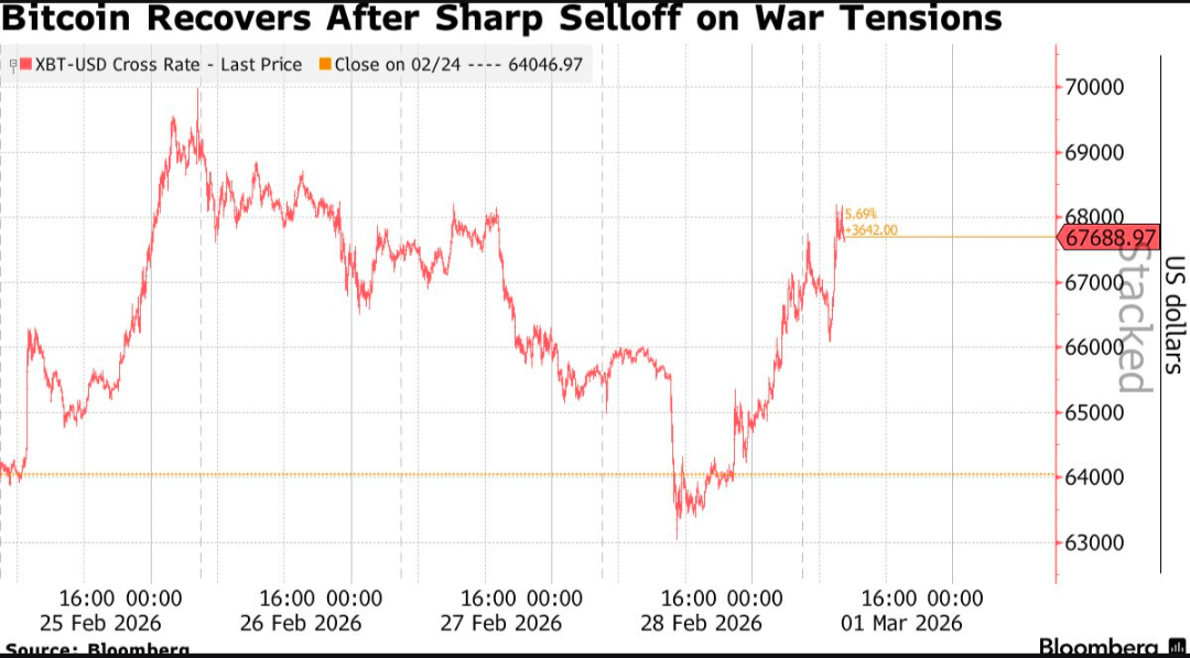 Cryptocurrencies experienced sharp but short-lived volatility, underscoring their role as a "risk-on" asset amid geopolitical turmoil. Bitcoin (BTC) plunged 4-5% to around $63,000-$64,000 immediately after the February 28 strikes, wiping out $128 billion in market cap through liquidations.3fd1a2 Ethereum $ETH dropped to $1,841 before rebounding over 6.5% to nearly $2,000.ba510e By March 2, BTC had recovered to $67,000-$70,000, flirting with pre-war levels, as rumors of Khamenei's death and market stabilization fueled a bounce.