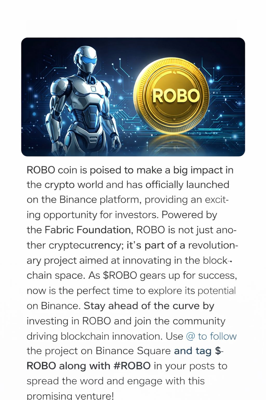 Now is a great time to learn more about $ROBO, follow its development updates, and engage with the community on Binance Square. Share your thoughts, insights, and analysis about ROBO, and be part of the growing conversation around this dynamic project.