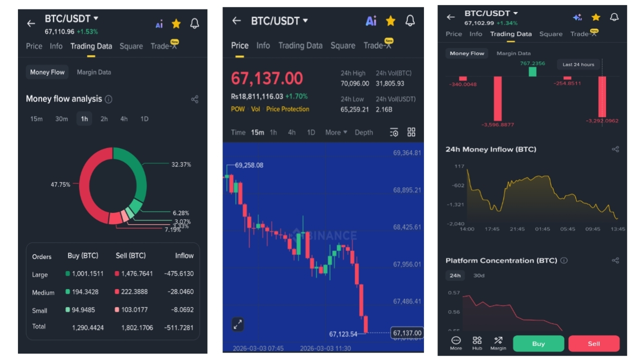 Total 24-hour trading volume stands near 31,805 BTC, translating to roughly 2.16 billion USDT. Participation is not weak. Capital is moving. However, money flow analysis reveals a net outflow of approximately 511 BTC. Large orders alone show a negative imbalance of roughly 475 BTC.