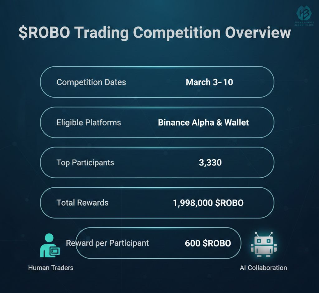 The Fabric Protocol (ROBO) Trading Competition is live on Binance Alpha and Wallet (Keyless)! From March 3 to March 10, traders can compete by purchasing ROBO tokens. The top 3,330 participants will share 1,998,000 $ROBO , receiving 600 each. Only trades via Binance platforms count, with selling excluded and no volume limits.