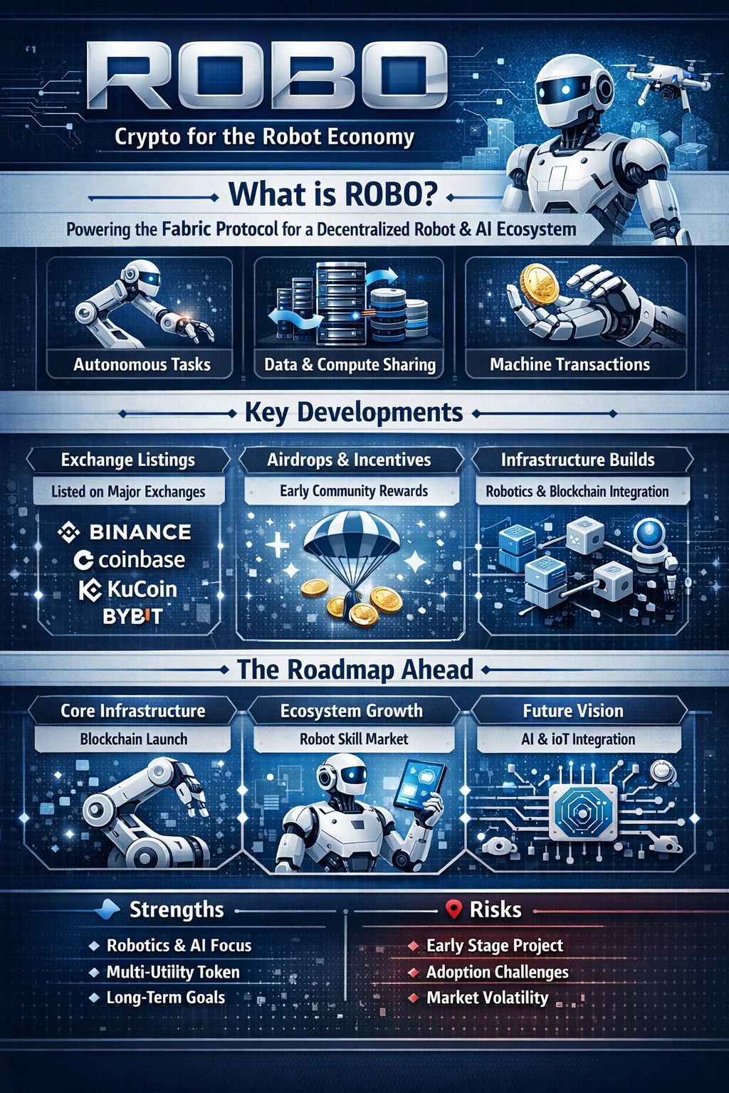 ROBO è il token nativo dell'ecosistema Fabric — un progetto focalizzato sulla connessione della robotica, dell'intelligenza artificiale e della tecnologia blockchain in un'unica struttura decentralizzata. Invece di costruire un'altra piattaforma DeFi o una meme coin, ROBO punta a qualcosa di molto più ambizioso: consentire a macchine e agenti AI di transigere e coordinarsi in un'economia basata su blockchain e senza fiducia.