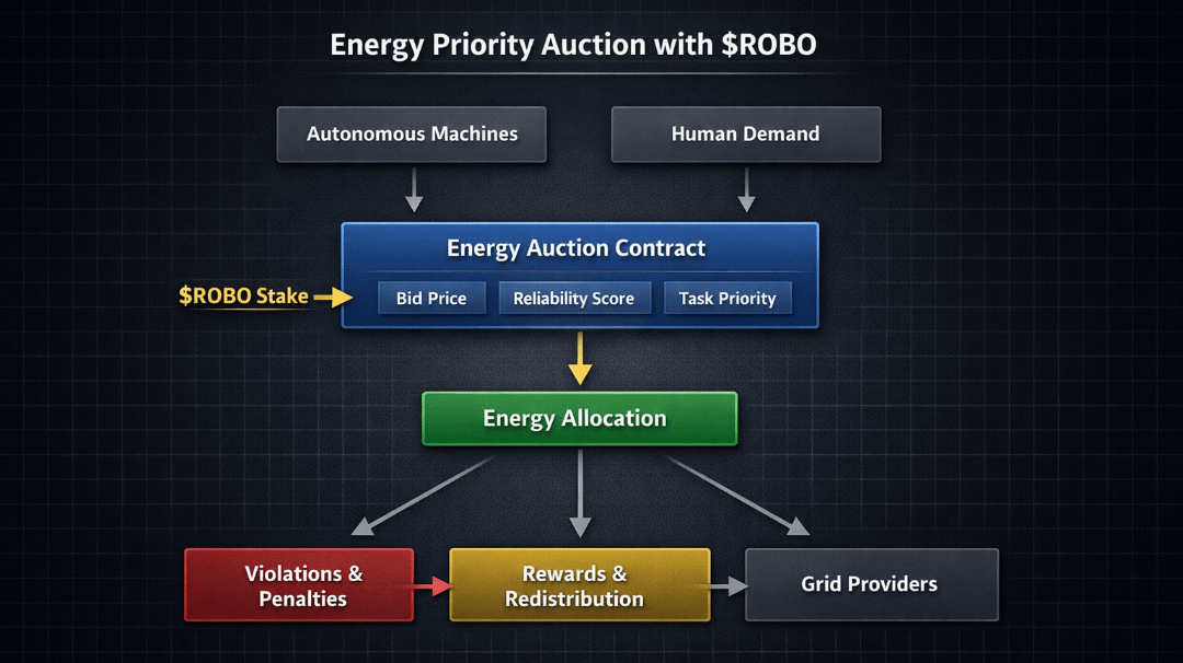 Picture a simple diagram embedded here: on the left, “Autonomous Machine Operators” submit forecast bids with ROBO stake. In the center, an “Energy Priority Auction Contract” ranks bids using price × reliability coefficient. On the right, “Grid Providers” receive allocation signals and deliver electricity. Beneath the diagram, arrows loop back from delivery outcomes to reliability scores, adjusting future priority weightings. The visual matters because it shows this is not just a price auction — it’s a credibility-weighted system.