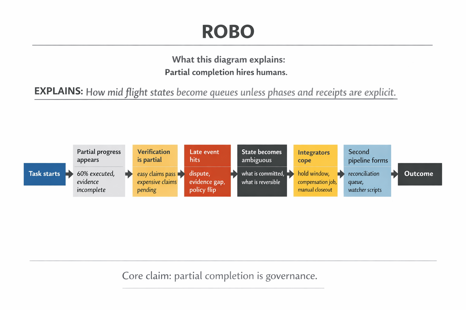 That is the frame I use when I think about ROBO. Not whether agents can execute. Not whether verification works in principle. The sharper question is this. When ROBO becomes a live work surface, does it treat partial completion as a first class state or as a visual progress bar.