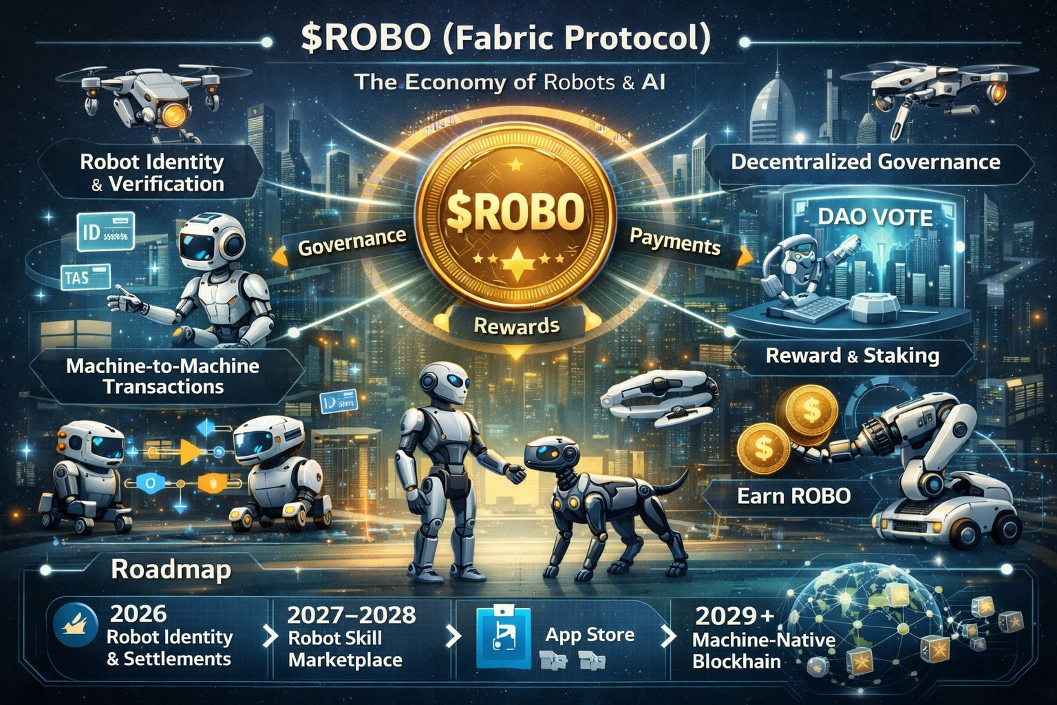@Fabric Foundation $ROBO is the native utility and governance token of the Fabric Protocol, a blockchain-driven infrastructure designed to power a decentralized Robot Economy where autonomous machines, AI agents, and humans can interact, transact, and coordinate value creation without centralized intermediaries.