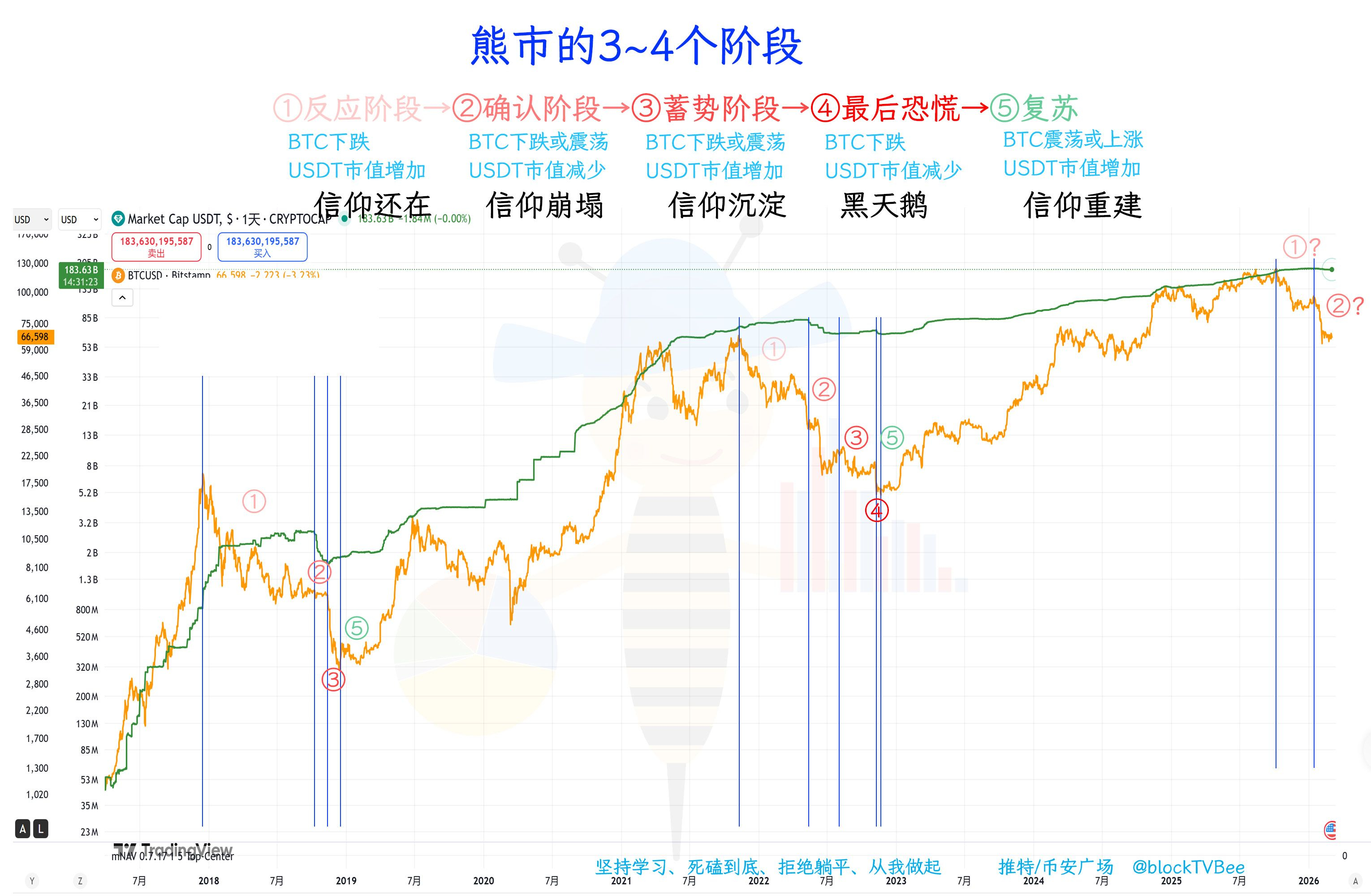 2026年01月06日疑似开始了进入这个阶段,USDT市值开始减少,并且市场开始各种质疑BTC,质疑BTC的数字黄金属性,认为BTC会跌到3开头……
