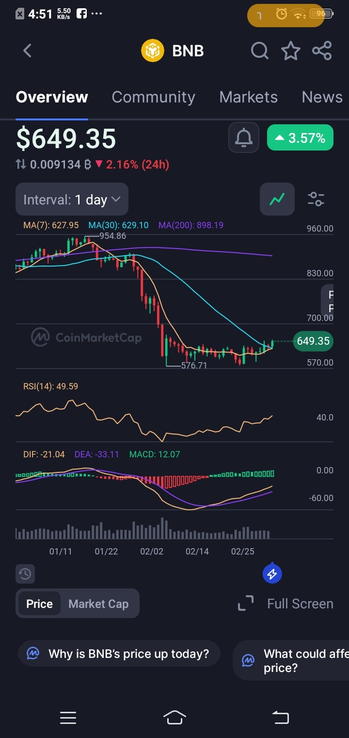 $BNB is showing signs of life after a prolonged downtrend. Price has reclaimed both the 7 and 30-day moving averages, currently trading at $649.35. This often signals a shift in short-term momentum. The MACD just delivered a bullish crossover (DIF crossing above DEA), and the histogram is printing its first positive bars. This suggests the selling pressure is exhausting and buyers are attempting to establish a floor.