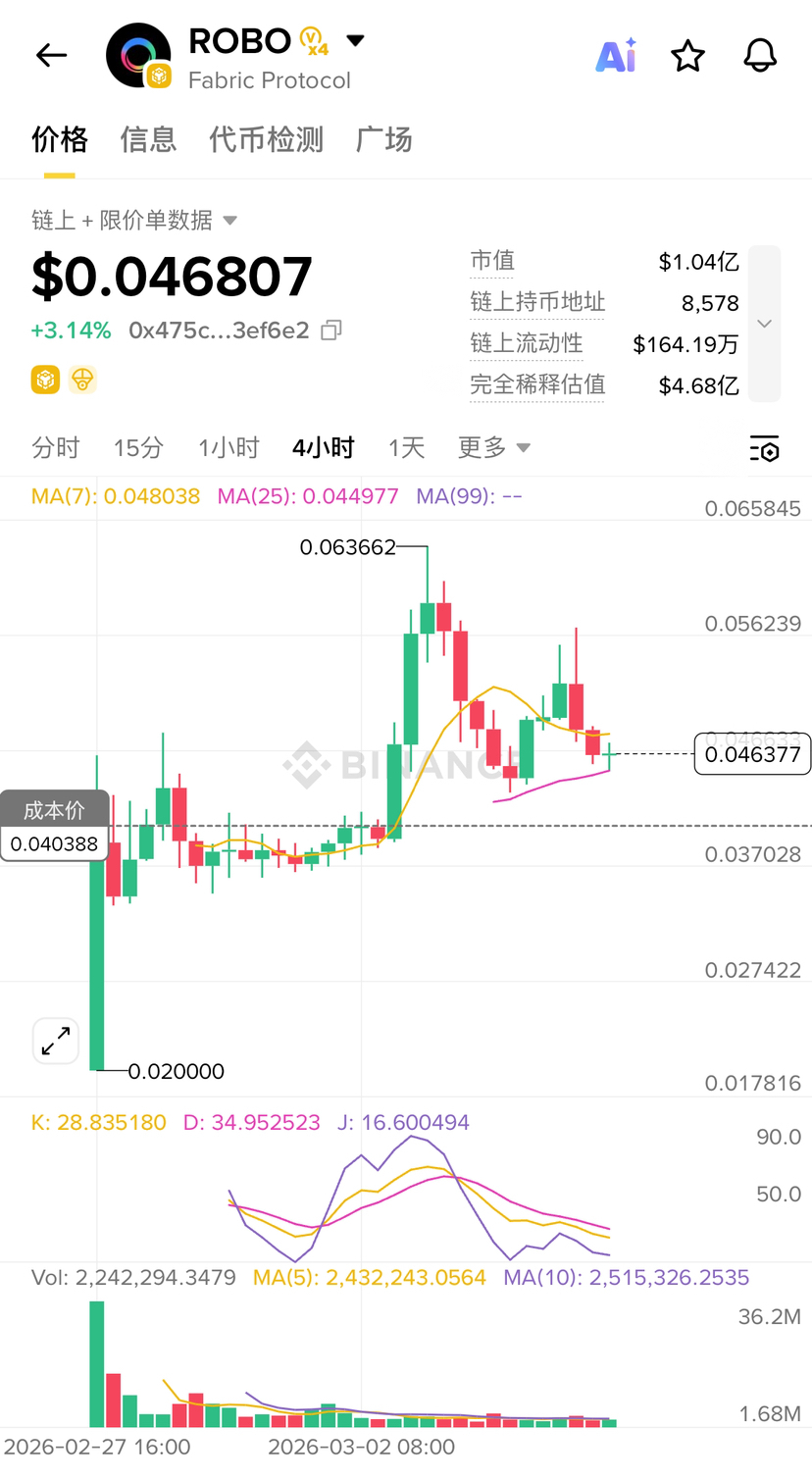 保守型(60%仓位,适合HODLer):现货逢低0.046吸,目标0.055(+13%),等Q1 OpenMind身份组件上线催化。
