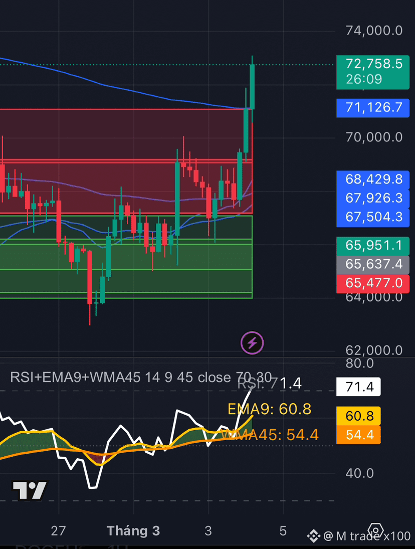 The H1, H4, and D timeframes haven’t finished their pullback yet — the momentum is still relatively strong. At this stage, if H4 enters a downward move, it will likely take until the end of tonight to fully play out. Throughout the night, the main direction is still a slight decline before continuing upward. The nearest resistance zone is around 74.5k to 75.5k.