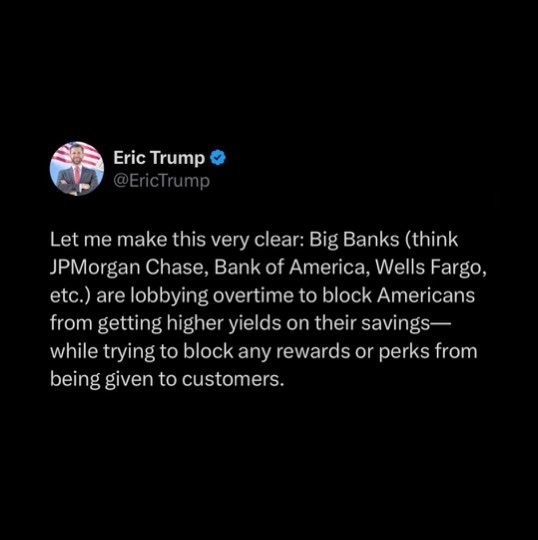 Un nuovo dibattito si sta intensificando attorno al futuro della finanza dopo che Eric Trump ha affermato che le principali banche statunitensi stanno cercando attivamente di impedire agli americani di accedere a rendimenti più elevati attraverso criptovalute e stablecoin. La sua dichiarazione tocca una crescente tensione tra le istituzioni finanziarie tradizionali e l'ecosistema degli asset digitali in rapida espansione.
