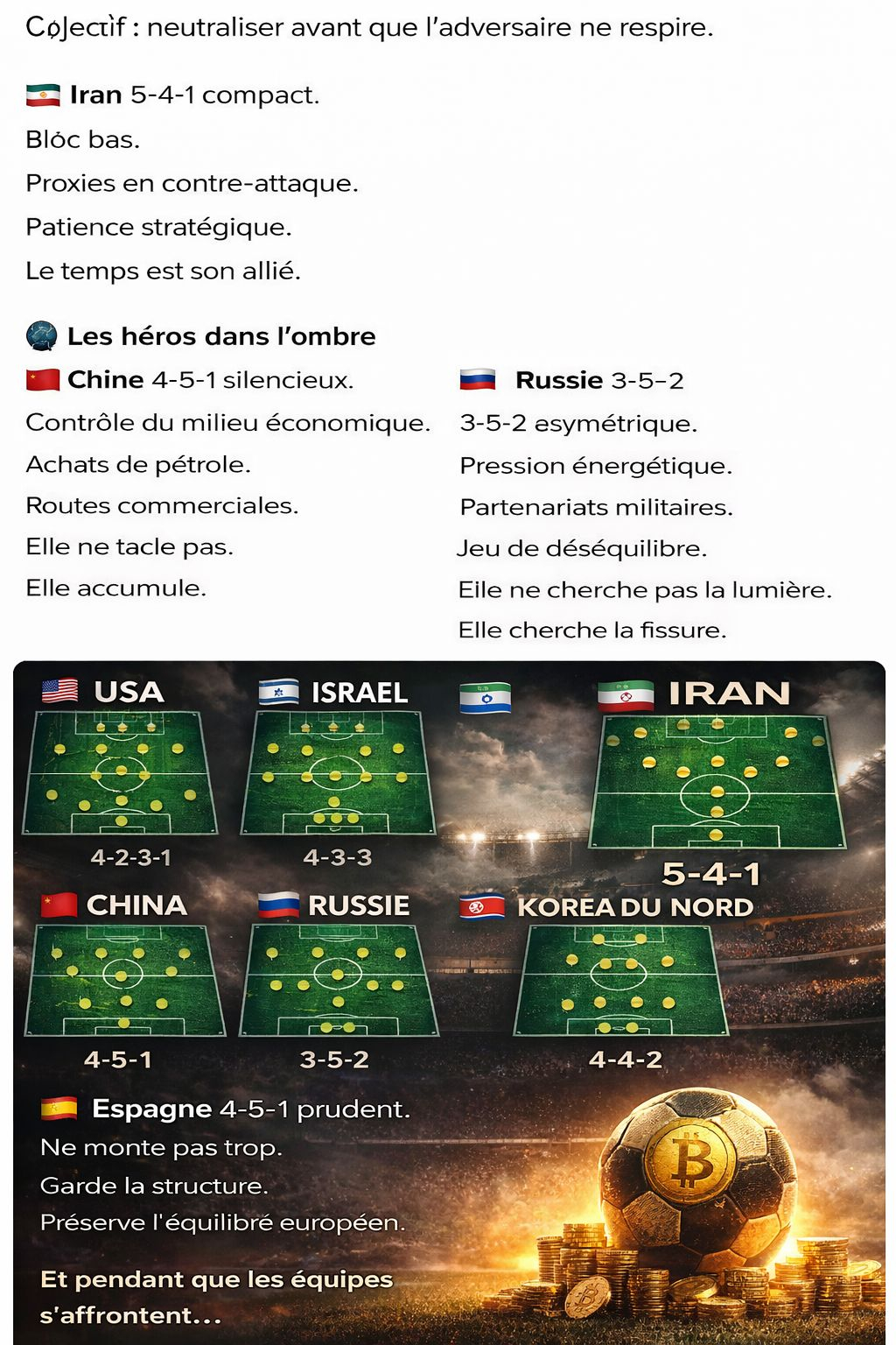 Pendant que les formations s’ajustent, le pétrole prend l'ascenseur, les marchés s'affolent, les capitaux se déplacent et le Bitcoin attend. Car le véritable trophée ne sera pas brandi dans un stade, mais visible dans les flux de liquidité.