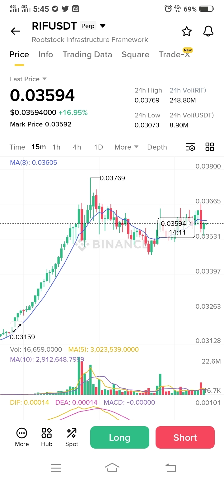 RIF (Rootstock Infrastructure Framework) is showing strength today, up +16.95% to $0.03594**, after bouncing from a low of **$0.03073 and challenging the 24H high of $0.03769. Let's break down this concerning setup.