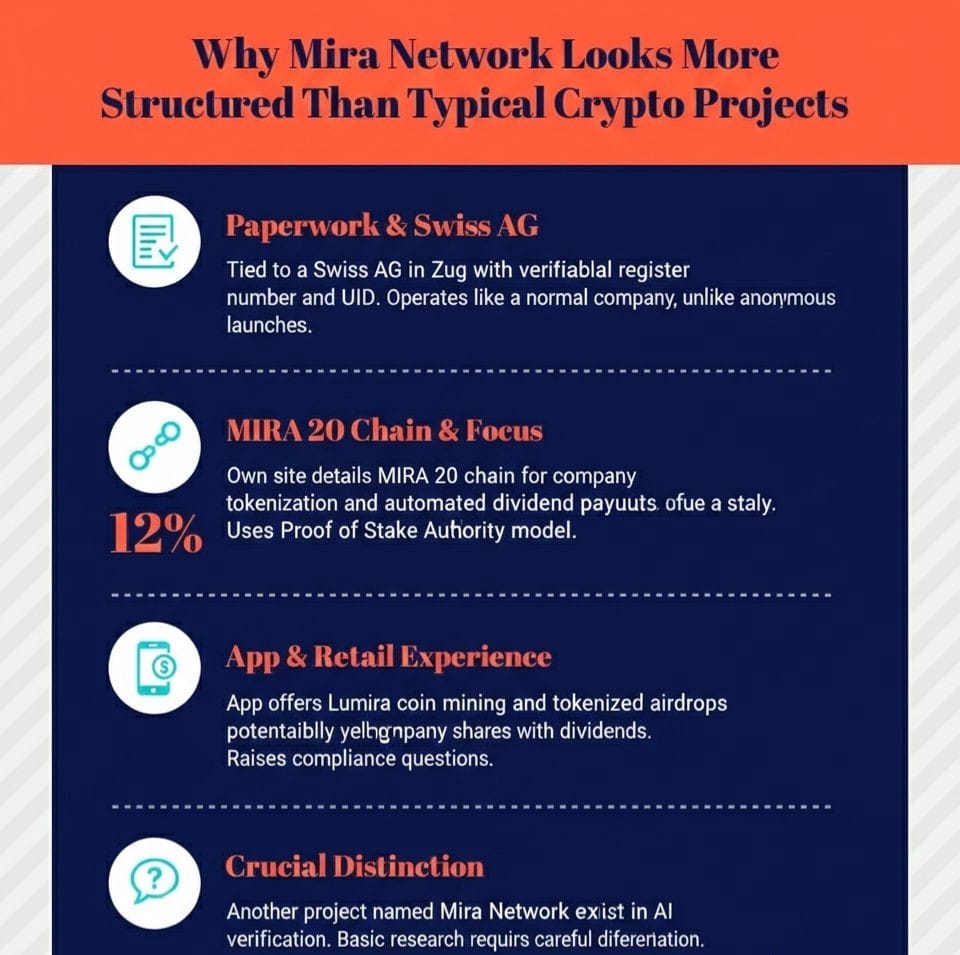 When I first looked into Mira Network, what stood out wasn’t hype but documentation. The project is connected to a Swiss AG registered in Zug, complete with a commercial register number and UID that can be publicly verified like a traditional company. That alone makes it feel more structured compared to many anonymous crypto launches.