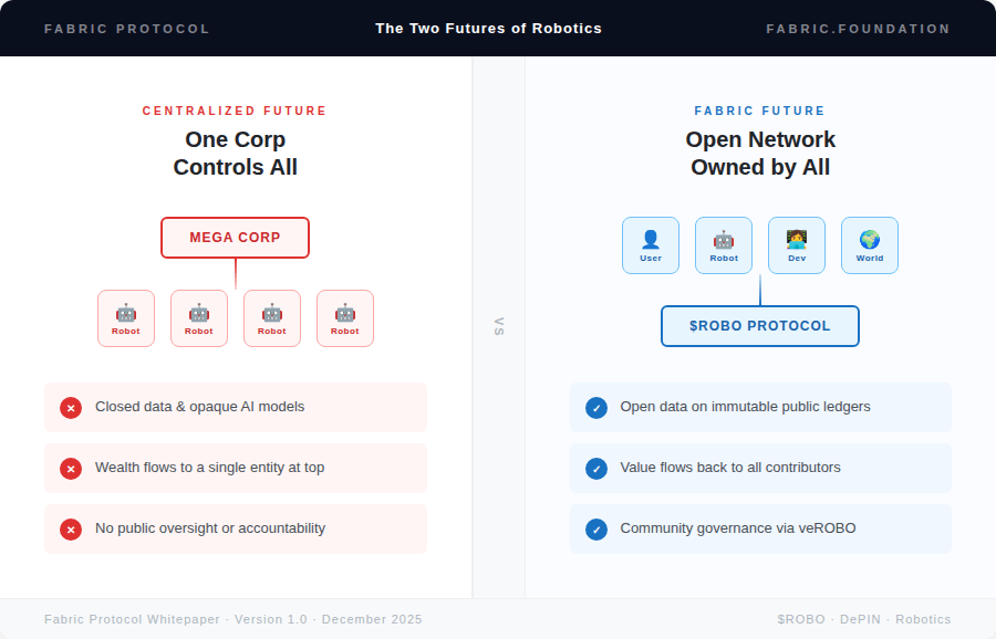 Here is a picture showing Centralized Future one corporation logo controlling all robots vs Fabric Future a decentralized network of humans and robots.