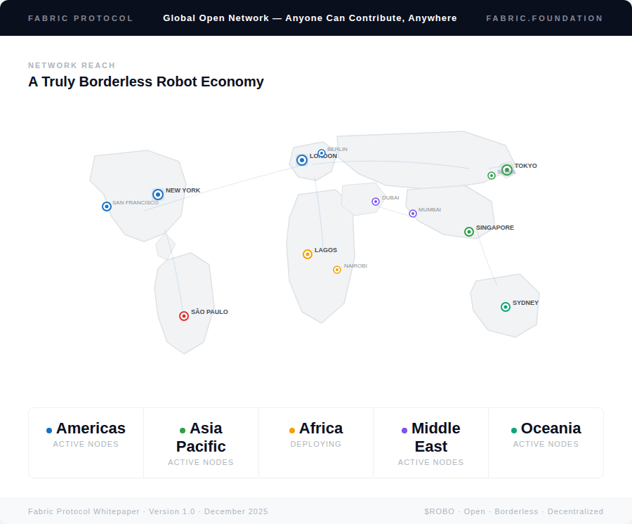 A world map with glowing nodes representing Fabric robot deployments across continents. Caption: "A global, open network — anyone can contribute, anywhere.