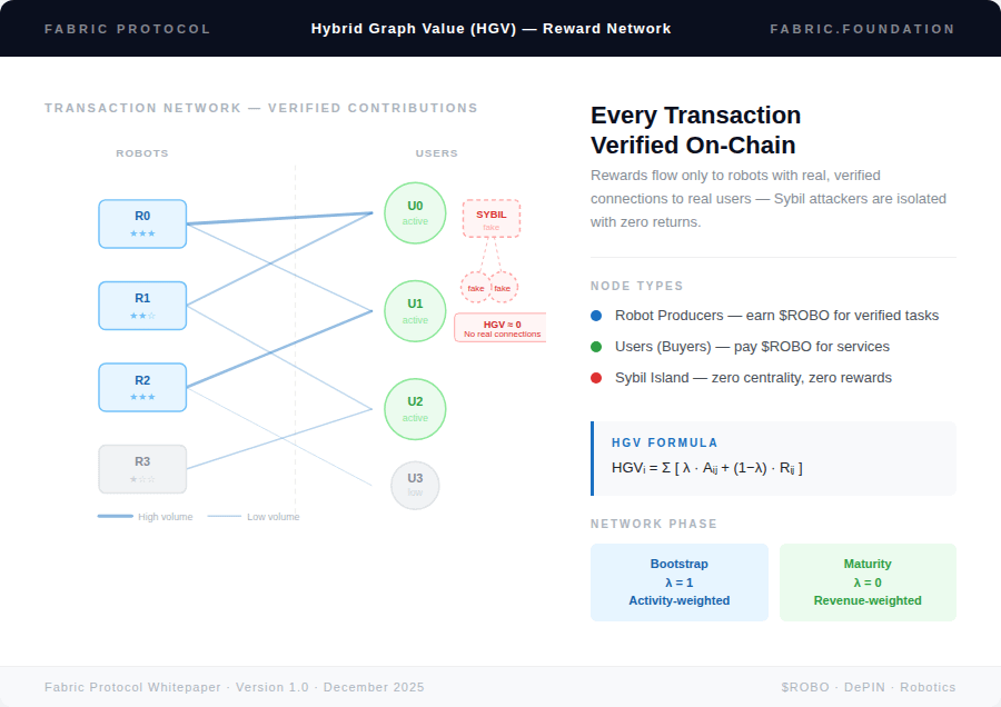 The HGV Transaction Graph diagram. This shows the bipartite network of robots producers connected to users buyers through verified transactions. Caption: Every transaction on Fabric is verified, recorded, and rewarded on-chain.