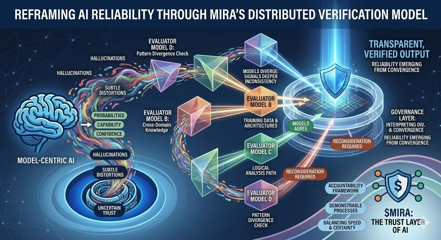 What makes this approach particularly interesting is that the objective is not blind agreement between models. Simple majority voting would offer only superficial reassurance since models trained on overlapping data often inherit similar assumptions and blind spots. Mira’s governance framework instead focuses on interpreting how models agree where they diverge and whether disagreement signals a deeper inconsistency within the claim itself. In other words reliability emerges not from uniform answers but from the structured examination of differences in reasoning.
