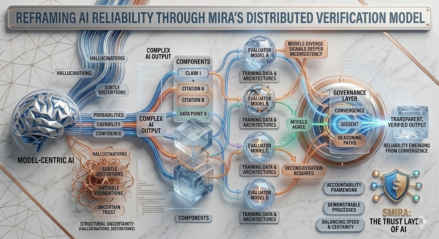This structural uncertainty is precisely the problem that Mira attempts to address, not by demanding perfection from a single model but by rethinking the entire process through which AI answers are produced and validated. In Mira’s architecture, an AI output is treated less like a finished conclusion and more like a hypothesis entering a verification pipeline. Instead of trusting the reasoning path of one model the system distributes evaluation across multiple independent models that examine the same claim from different perspectives each shaped by distinct training corpora architectures and internal biases.