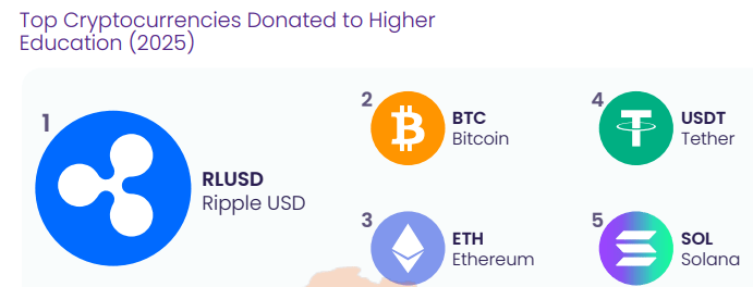 Una quota significativa delle donazioni in stablecoin è provenuta da Ripple USD (RLUSD), inclusa una promessa di 25 milioni di dollari da Ripple Labs a organizzazioni non profit DonorsChoose e Teach For America.
