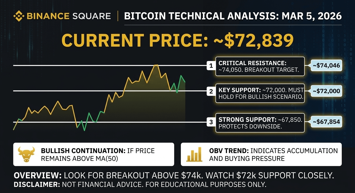 الدعم والمقاومة: نلاحظ محاولة السعر الثبات فوق منطقة 72,000$ بعد اختبارها بنجاح. المقاومة العنيفة التالية تتركز حول قمة 74,046$ التي سجلت خلال الـ 24 ساعة الماضية.