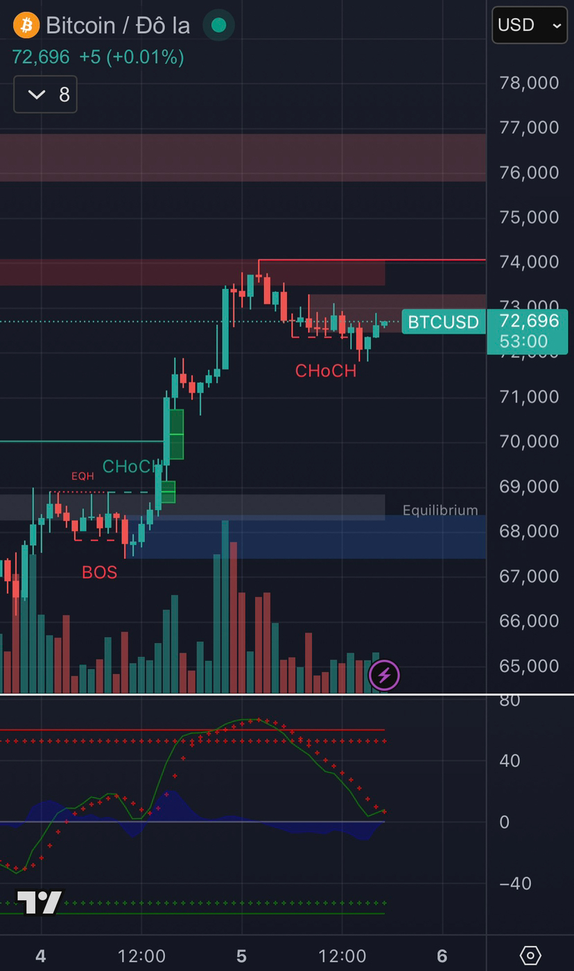 Trên khung H1 của Bitcoin so với USD, cấu trúc thị trường theo Smart Money Concepts đang nghiêng về xu hướng tăng ngắn hạn. Giá đã tạo BOS tăng từ vùng equilibrium quanh 68.000 USD và tiếp tục hình thành CHoCH tăng, đẩy giá lên vùng premium gần 73.000–74.000 USD.
