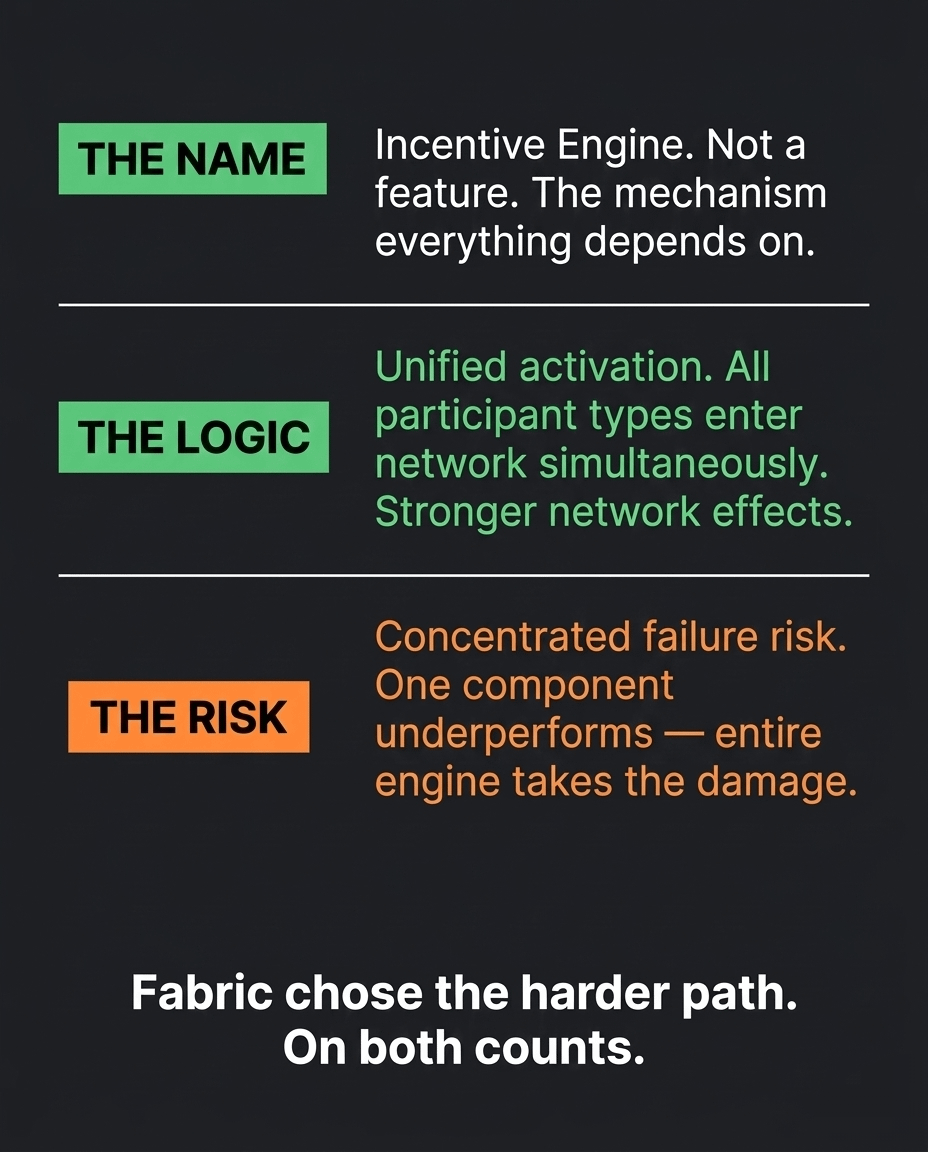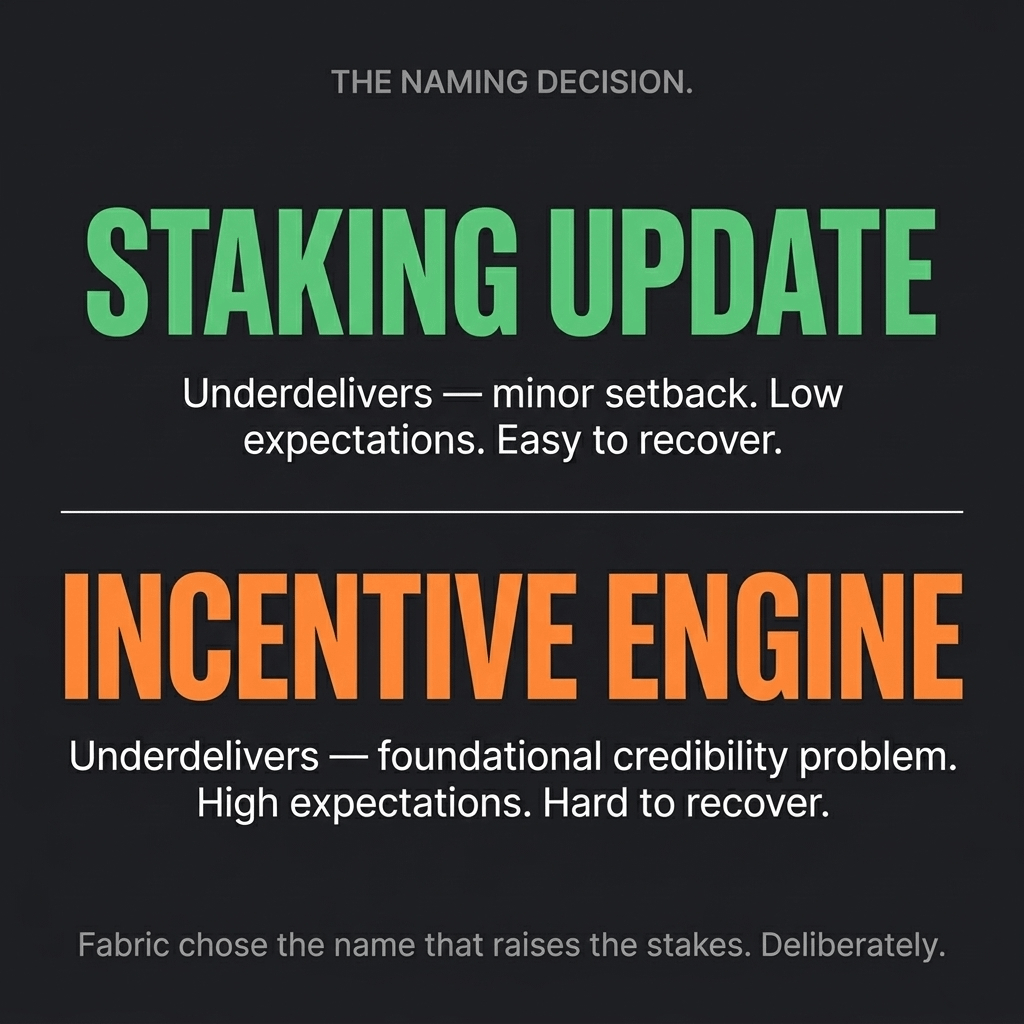 le convenzioni di denominazione nella crittografia sono raramente arbitrarie. quando un protocollo assegna un nome specifico a un sistema core, sta comunicando qualcosa di deliberato su come quel sistema si inserisce nell'architettura più ampia. Fabric non ha chiamato la sua prossima attivazione un aggiornamento di staking o un programma di ricompense. l'ha chiamata Incentive Engine.