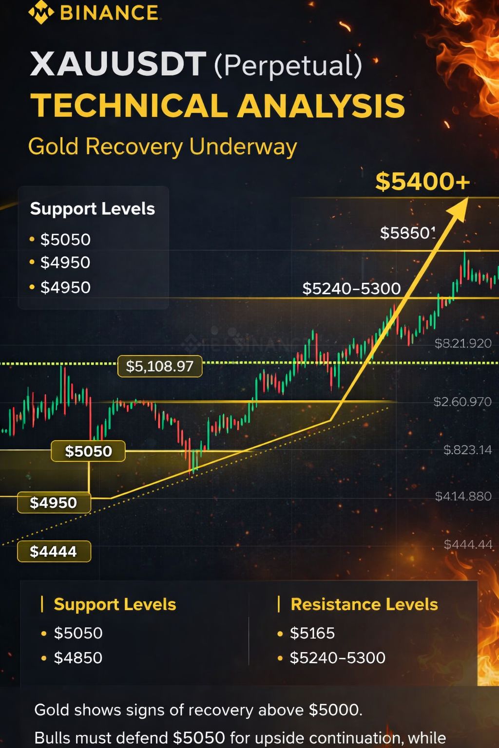 $XAU Overall, the chart suggests that Gold is in a recovery phase with bullish potential, but traders should watch the $5000 support and $5165 resistance carefully for the next directional confirmation. A breakout from this range will likely determine the next major trend for XAUUSDT.