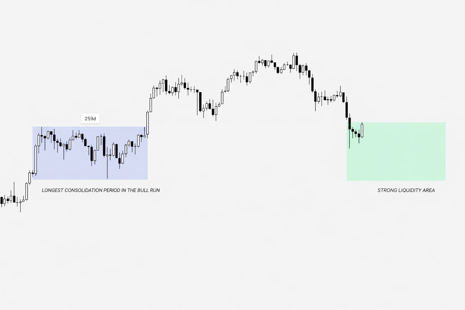 Questa è la zona di accumulo più lunga dell'intero ciclo di aumento. Da marzo a novembre 2024, Bitcoin è rimasto piatto per circa 259 giorni.