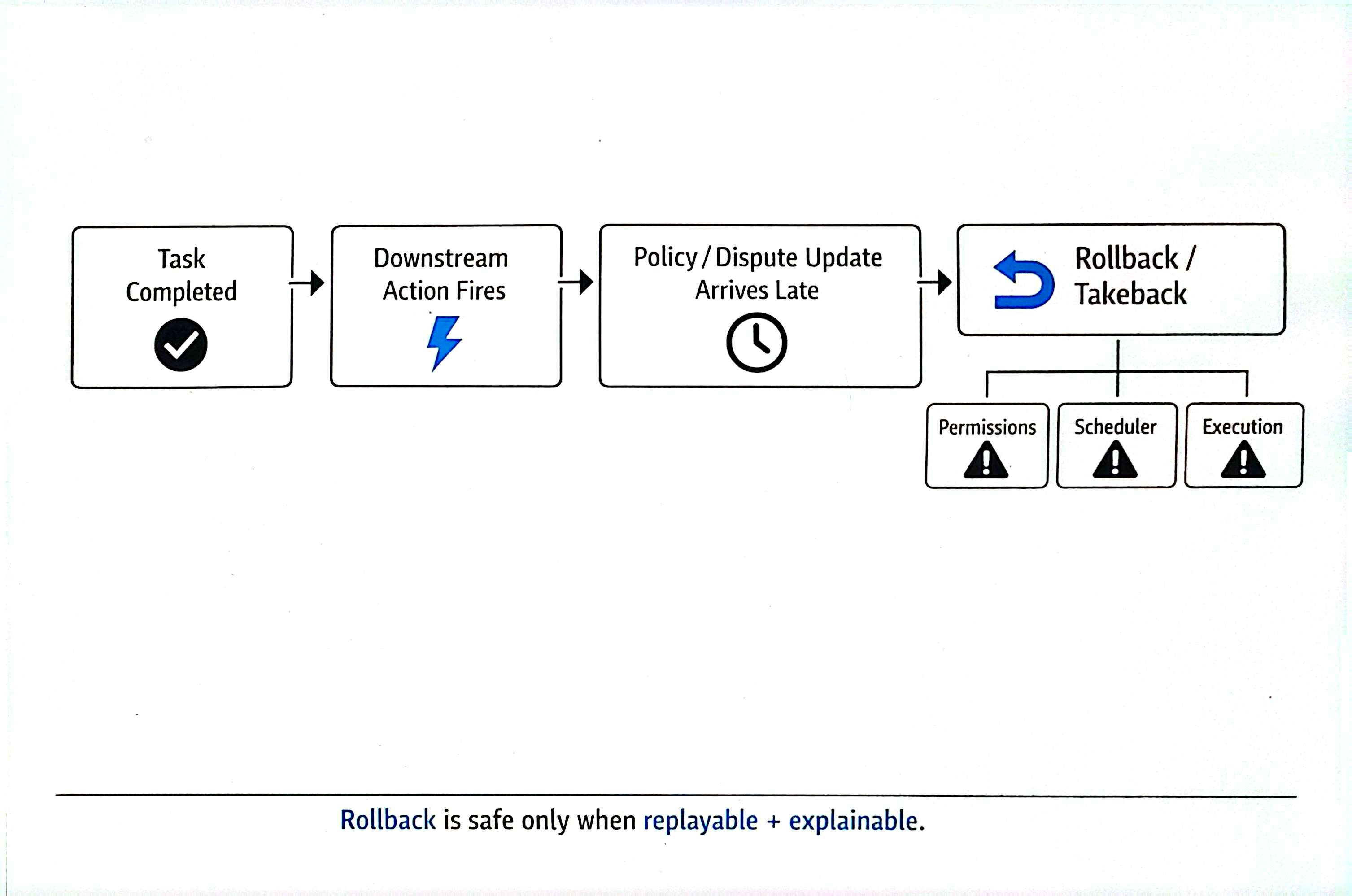 Undo is not a button in the coordination of robots. An achievement of one task leads to another. When an outcome is reversed by a system, it generates ambiguity in the downstream.
