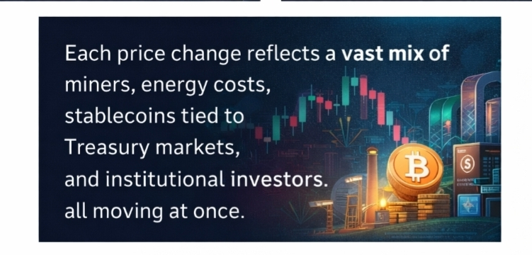 Quando qualcuno apre un'app di trading di criptovalute e guarda un grafico di Bitcoin, sembra ingannevolmente semplice. Un numero brilla sullo schermo. Candele rosse scendono, candele verdi salgono, e il prezzo sembra muoversi con una personalità tutta sua. Ma quel numero—circa settantamila dollari in questo momento—non è solo un prezzo. È il battito cardiaco visibile di un sistema vasto e vivente che si estende ben oltre lo schermo nella tua mano. Dietro ogni piccolo movimento su quel grafico ci sono migliaia di computer che risolvono puzzle crittografici, trader che prendono decisioni in frazioni di secondo, enormi centri dati che consumano elettricità e investitori istituzionali che muovono silenziosamente miliardi di dollari attraverso pipeline finanziarie che non esistevano nemmeno un decennio fa.