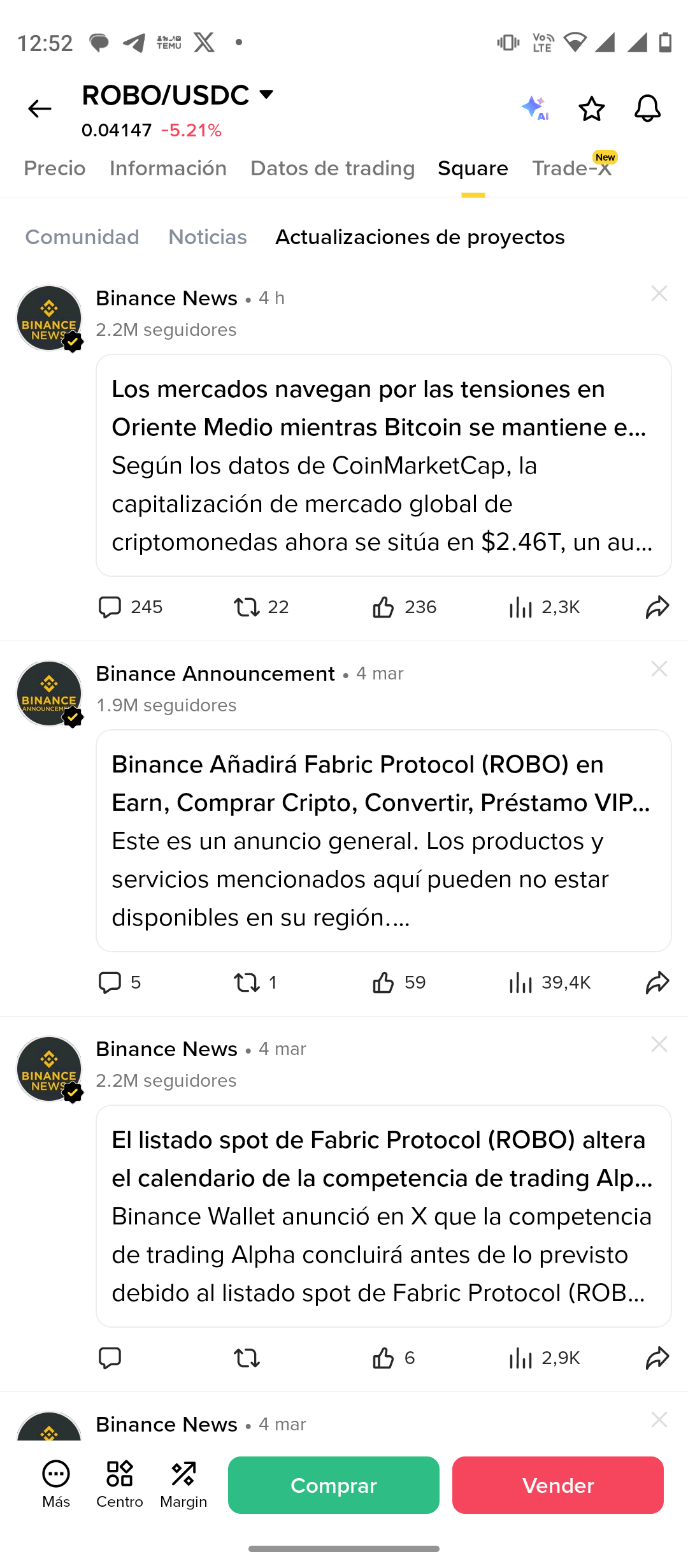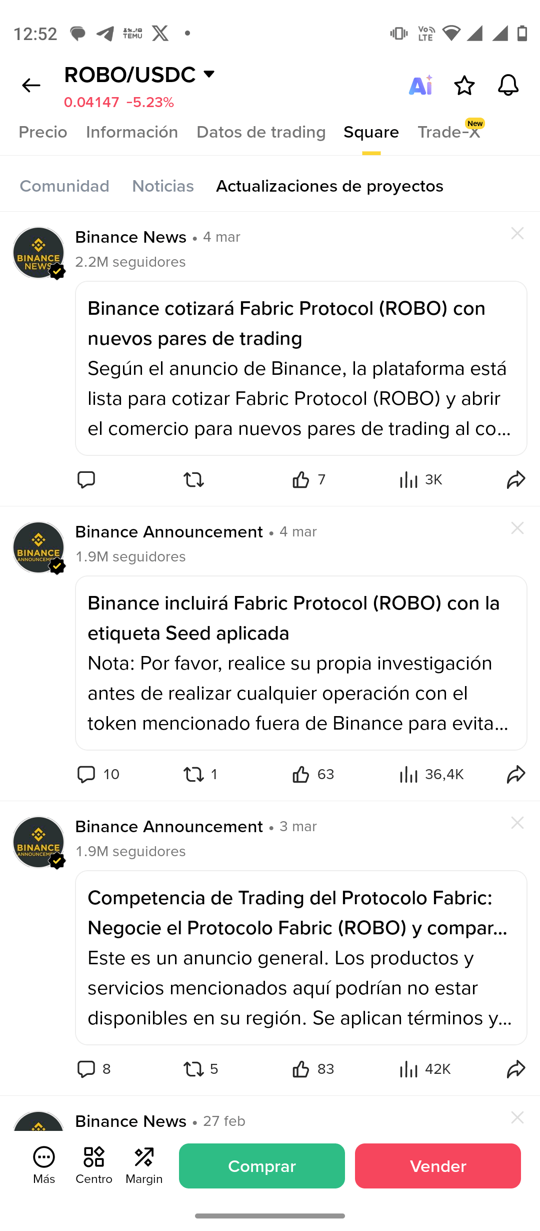 (Justo aquí. Este pantallazo funciona como “segunda capa”: el mismo feed del perfil del proyecto, reforzando que no fue un pantallazo aislado sino un entorno persistente en Binance Square.)
