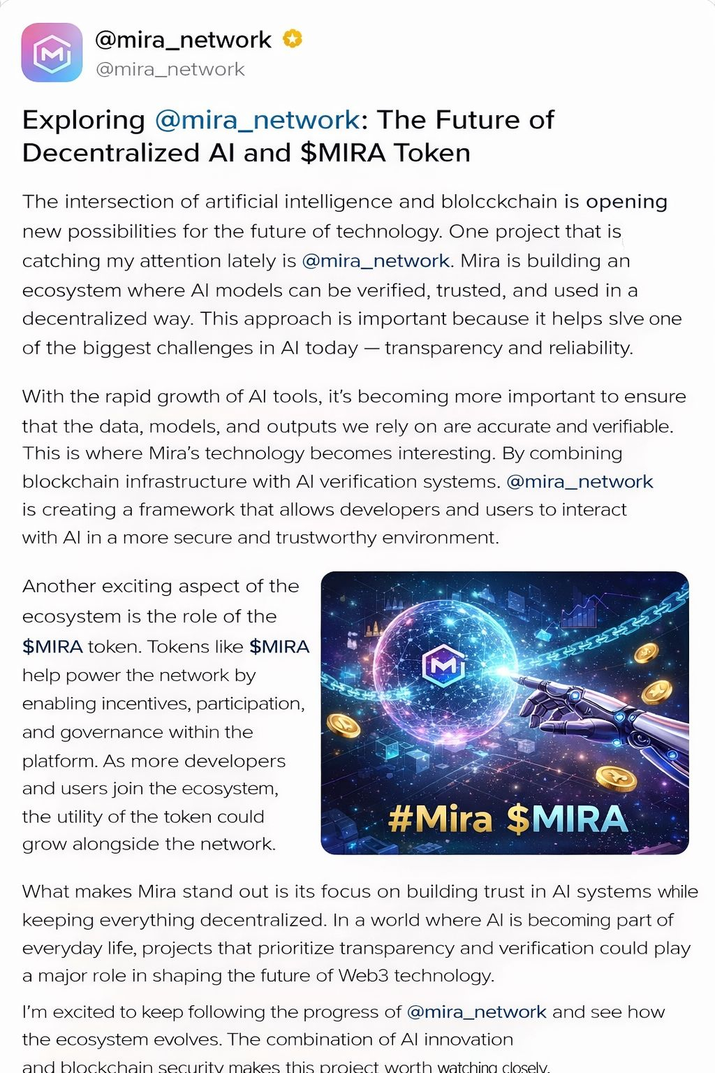 What makes Mira stand out is its focus on building trust in AI systems while keeping everything decentralized. In a world where AI is becoming part of everyday life, projects that prioritize transparency and verification could play a major role in shaping the future of Web3 technology.
