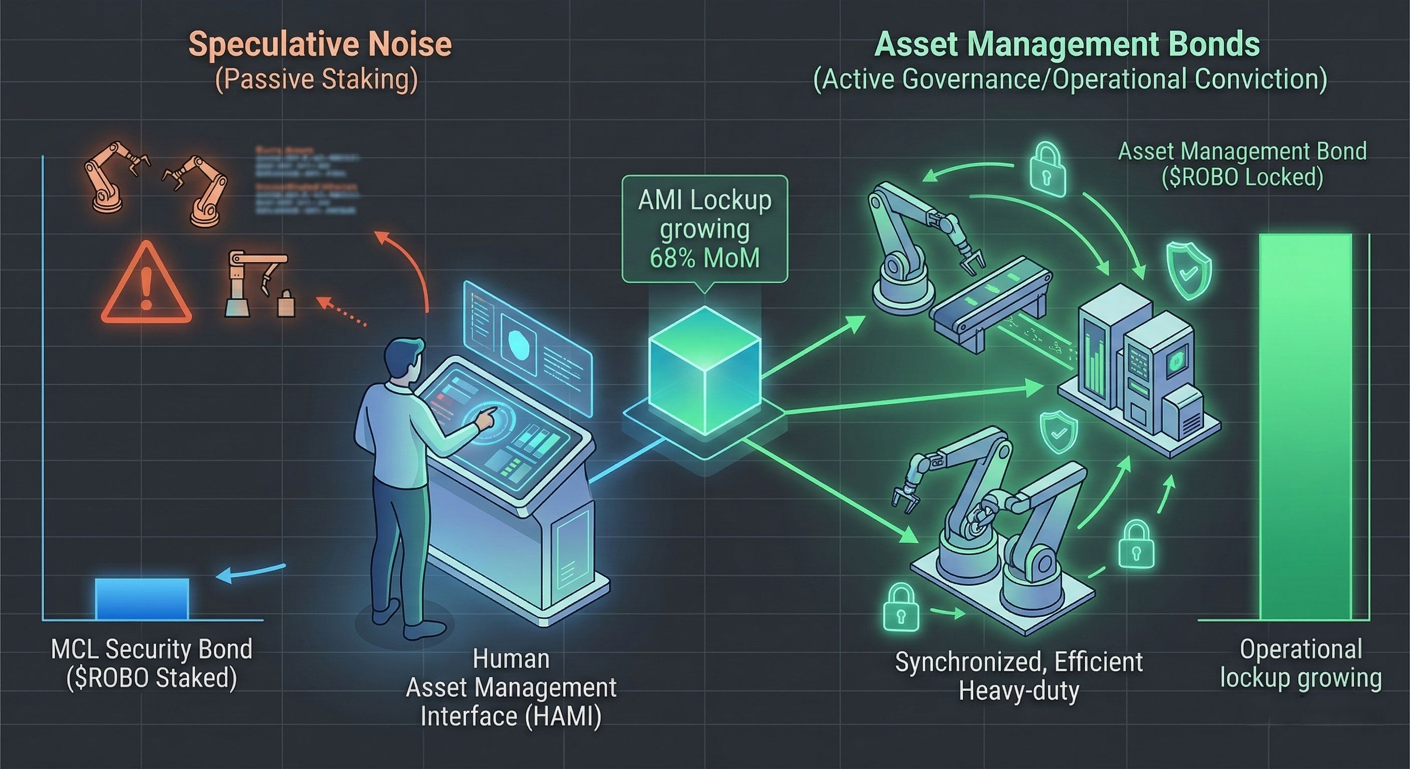 The AMI allows decentralized human commanders to manage their automated portfolios by defining operational constraints that the machine swarms mathematically execute. Staking not just a standard Service Bond, but a compounding Asset Management Bond (AMB) grants commanders the operational authority to set customized DAO parameters for specific fleets. These bonds introduce massive, compounding token lockup that directly reflects operational commitment and creates intense scarcity.