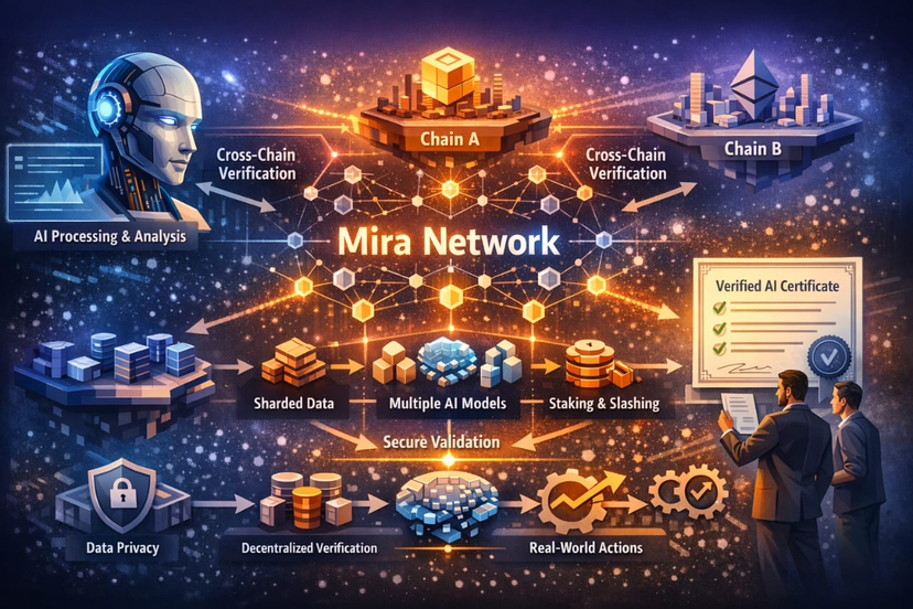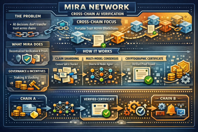 On Chain A, an app or agent generates a candidate statement or plan. Mira verifies it off-chain through its networked process and produces a certificate. On Chain B, a contract or service doesn’t need to “trust the model.” It needs to verify the certificate format and policy rules your application sets. The trust anchor becomes the certificate and its linkage to a verification event, not a brand name model.