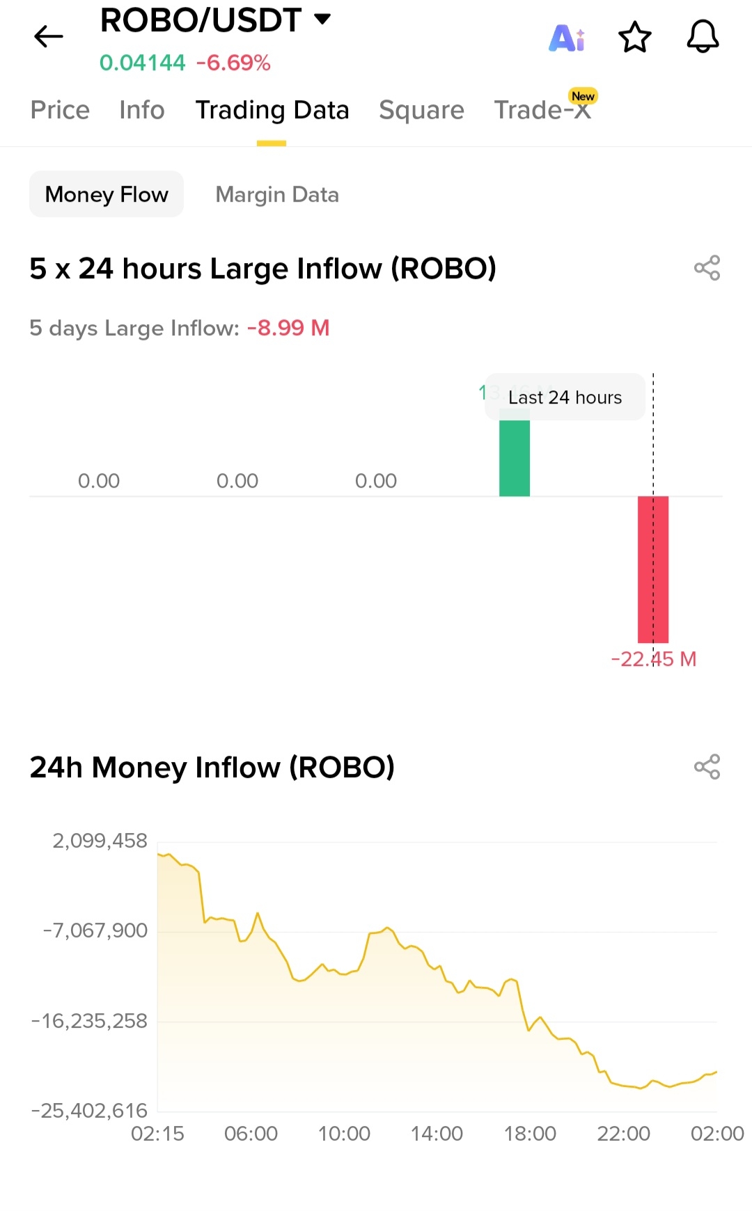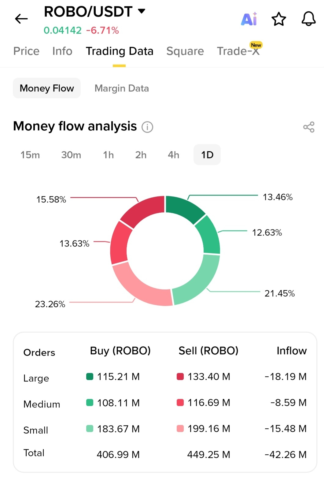Right now ROBO is trading at $0.041142, down about 6.71% on the day. That red candle looks heavy, but the money flow data is giving some interesting hints.