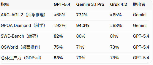 编码/Agentic(SWE-Bench / OSWorld):三者都在80%左右,GPT-5.4在真实桌面操作(OSWorld 75%)和GDPval知识工作(83%)最强,Grok多代理后追得很猛。