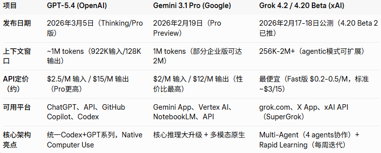 GPT-5.4刚发布就把“专业工作”卷到新高度;Gemini 3.1 Pro在纯推理和多模态上继续领跑;Grok 4.2则用多代理+每周迭代的独特打法,把“持续进化”做成了核心竞争力。不过xAI下周就发Grok Beta3了,估计又要卷死另外两家了>_<