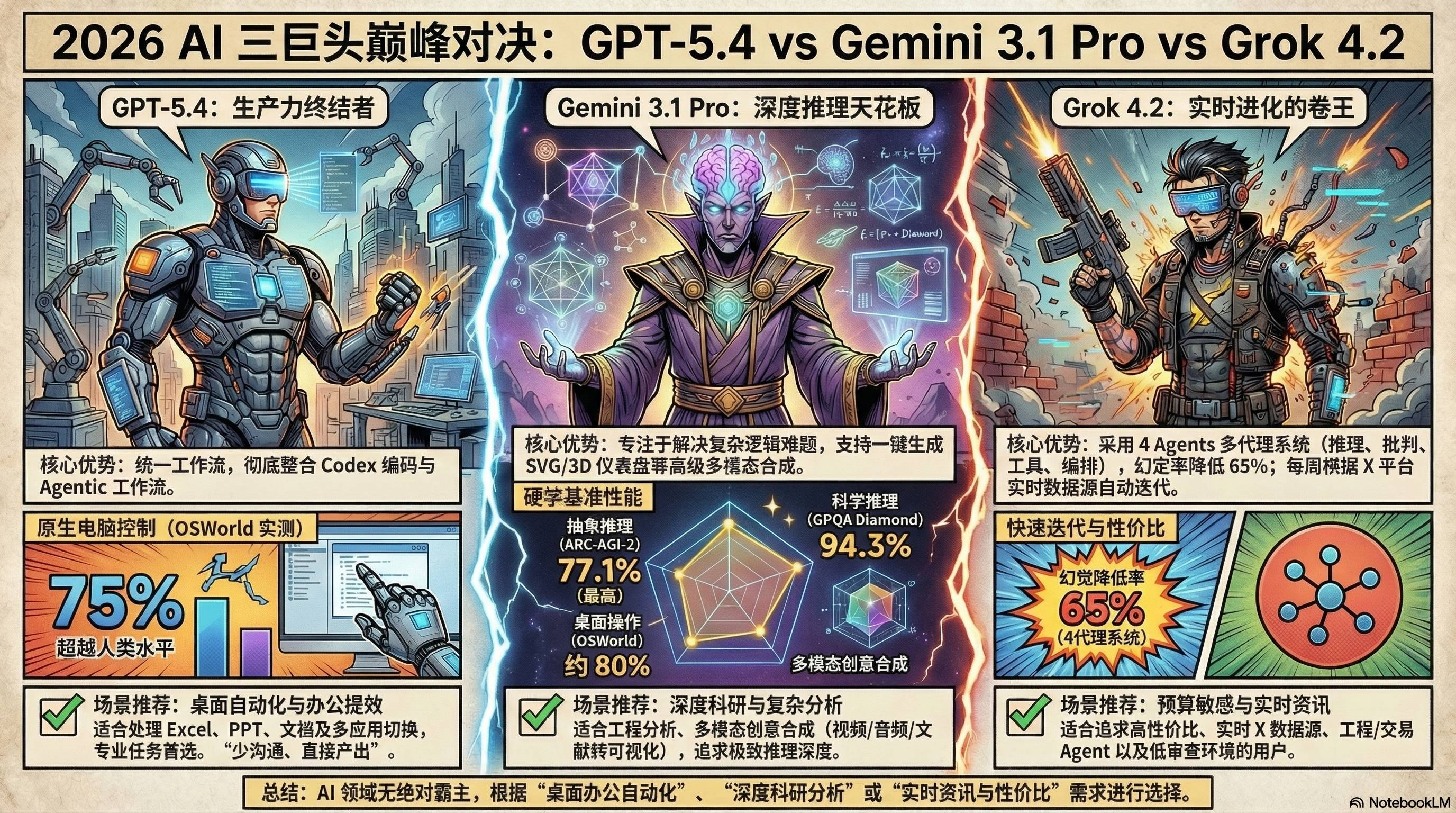 一句话帮你总结:Gemini 3.1 Pro 推理最强、GPT-5.4 生产力最实用、Grok 4.2 性价比与进化速度最卷。 这里没有绝对的王者,只有当下最适合你的那一个。(我个人最喜欢和Grok 4.2 Beta聊天,四个Agent各有性格,互相吐槽超好玩!不过这真不是广告😂)
