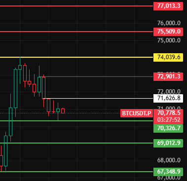 Se oggi non riesce a superare 71630, significa che la correzione di 4 ore deve continuare. Fai attenzione ai livelli di supporto sotto, intorno a 70330-69000-67350!