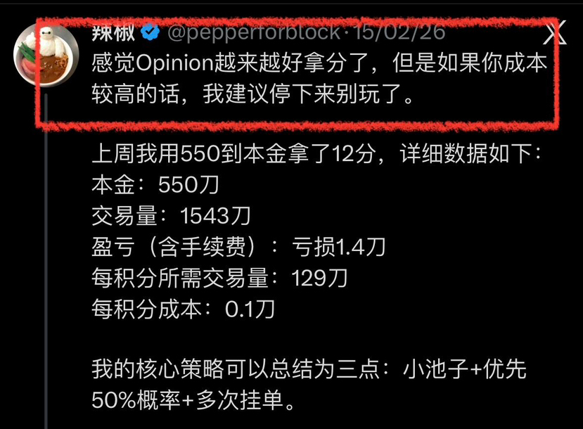 我没有打KOL轮,和Opinion没有任何利益关系。最近两个月写了很多关于Opinion的策略,每周都在测试得分权重。每天花费至少10小时在手动找池子。把积分成本从最初平均30刀降低到了1刀左右。之前也提醒过成本较高的兄弟不要盲目玩opinion。虽然我的资金没有被反撸,但是身心健康受到了巨大伤害。