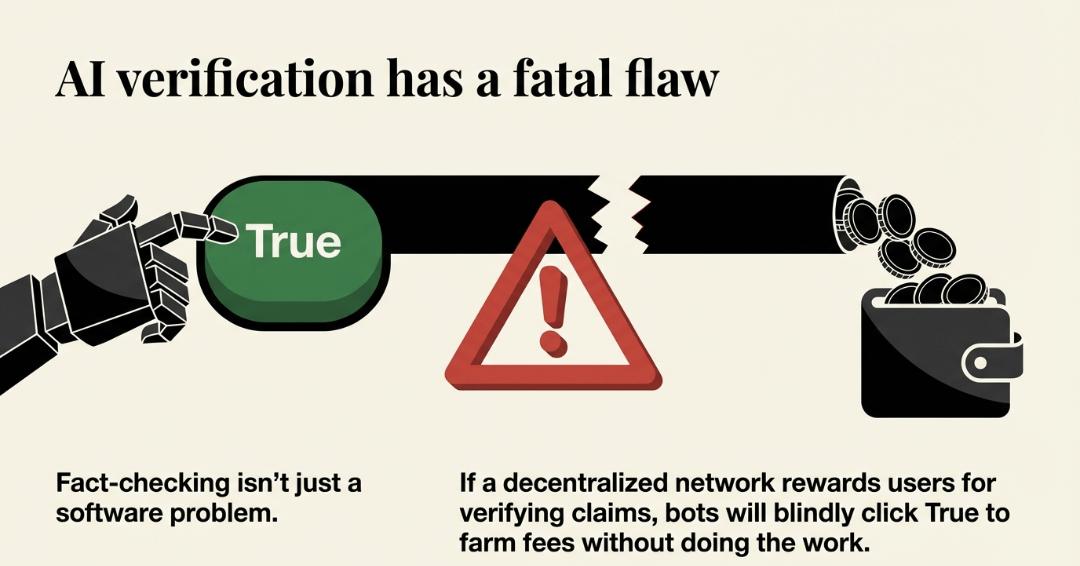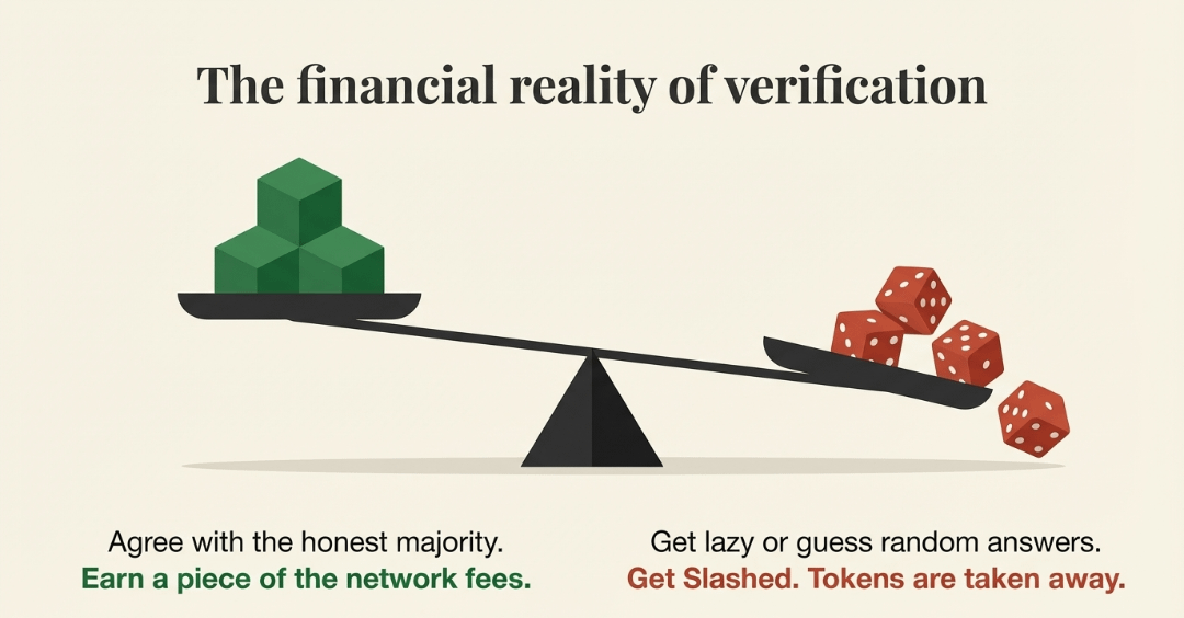 Most people think AI verification is just a software problem. But if you have a decentralized network of computers checking facts, what stops them from just guessing? If a bot can click "True" on every claim to collect a fee without doing the work, the whole system breaks. This is why the Verifier Economy is the most important part of the project.