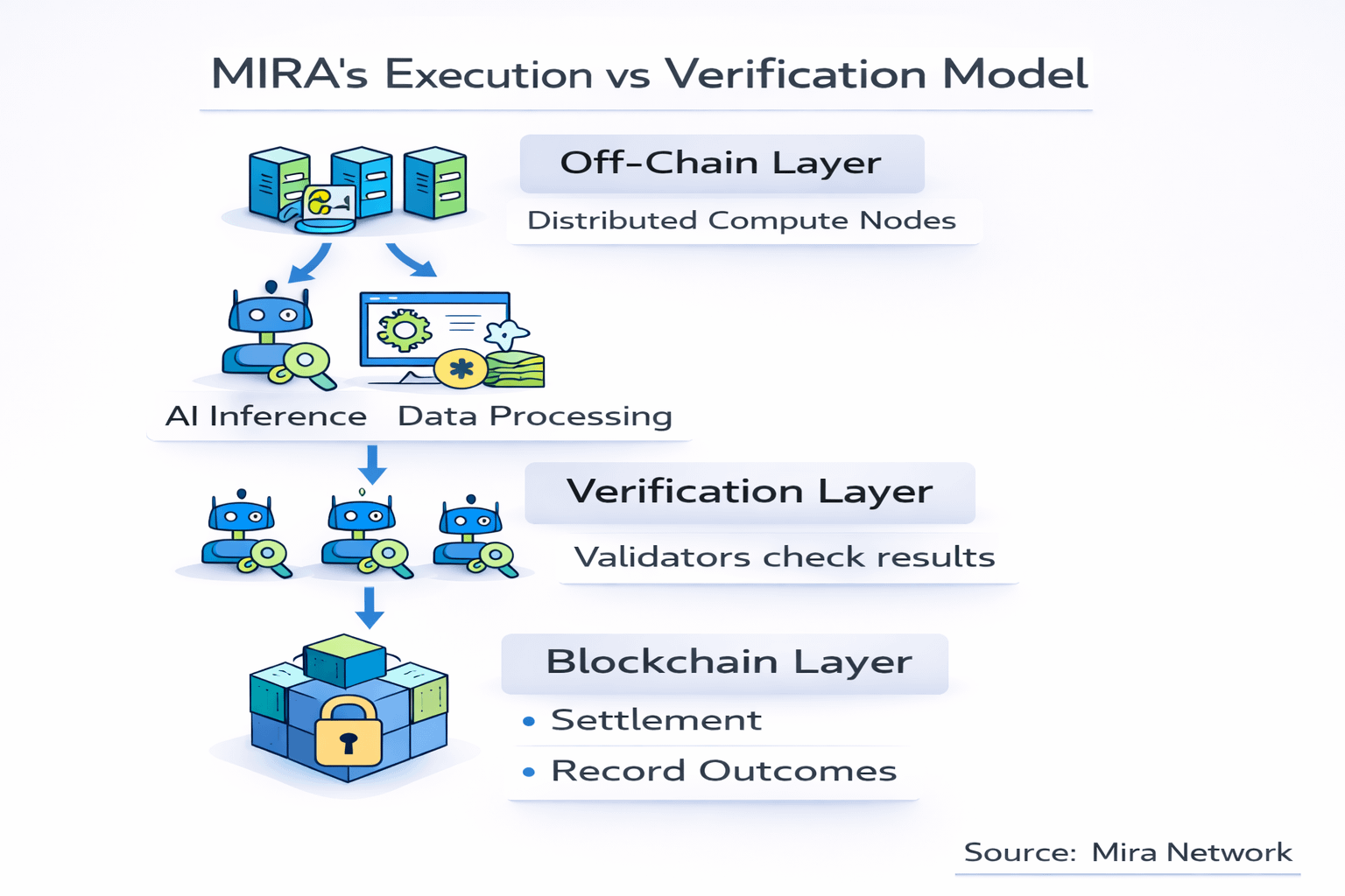 MIRA seems to approach the problem differently. Instead of forcing all activity directly onto the blockchain, it treats the chain more like a coordination layer. The heavy computational work — model inference, data processing, complex calculations — can happen off-chain across distributed nodes.