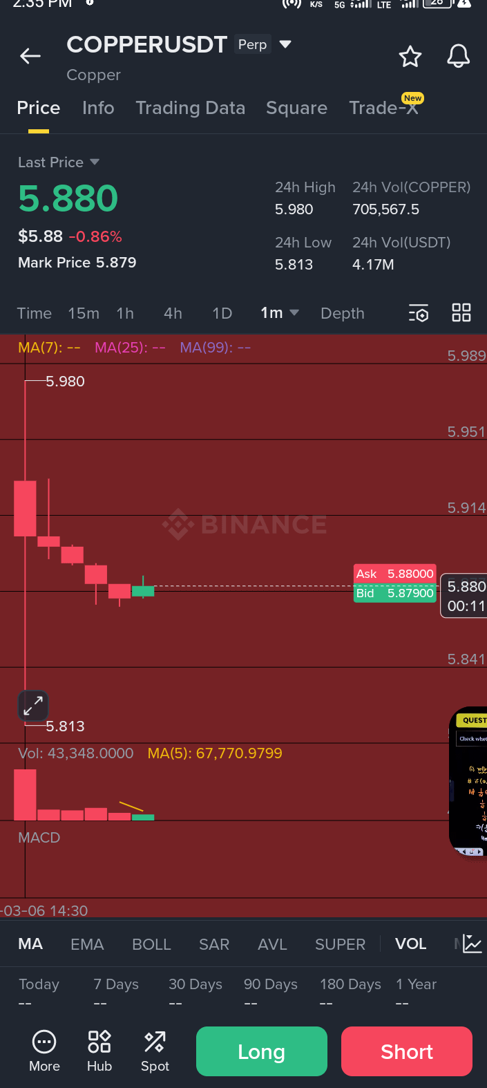 Tracking the extreme micro-volatility on the $COPPER /USDT perpetual contract today. Following a massive and aggressive liquidity grab that pushed the price from the 5.980 highs down to the 5.813 level, the market is currently consolidating heavily around 5.880.